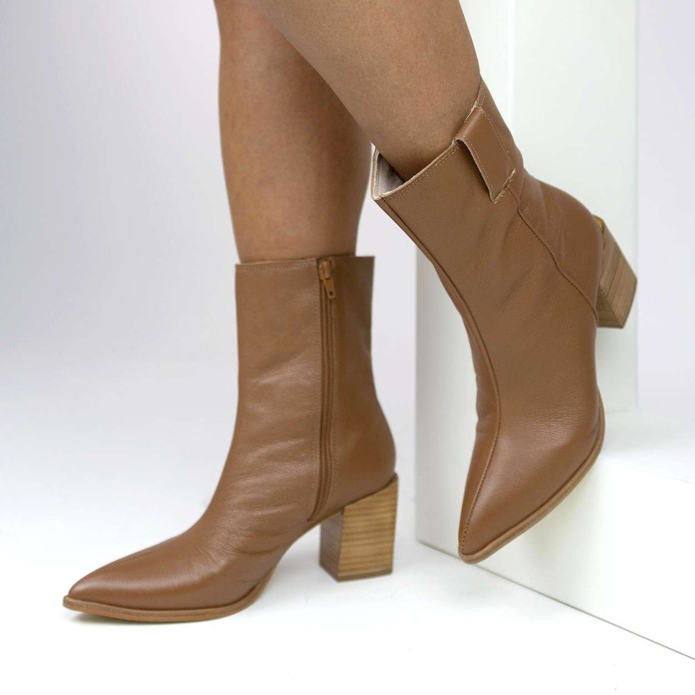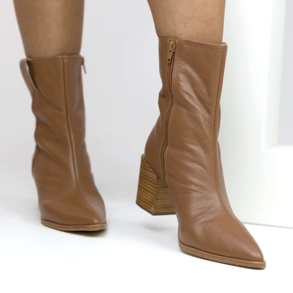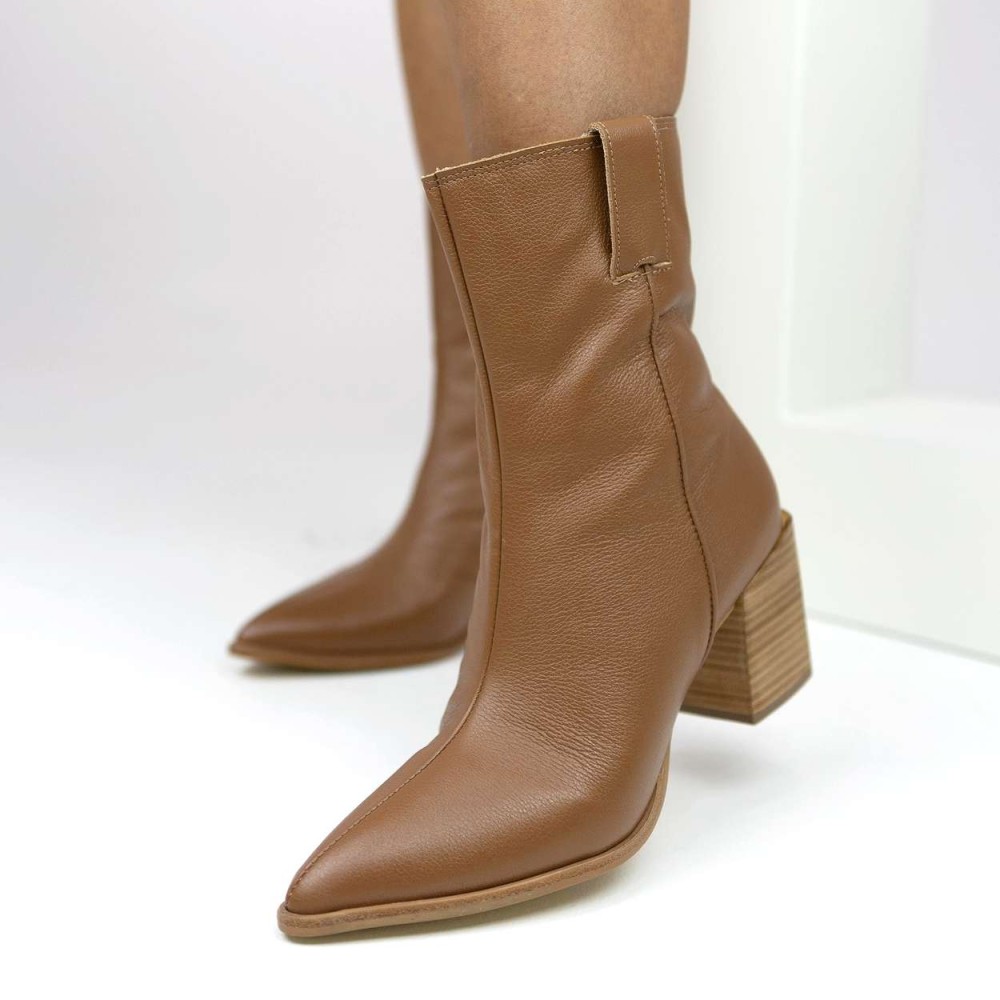 Simplicidade e elegância duradoura se unem em nossa bota Laís, minimalista em couro na cor caramelo de salto bloco.