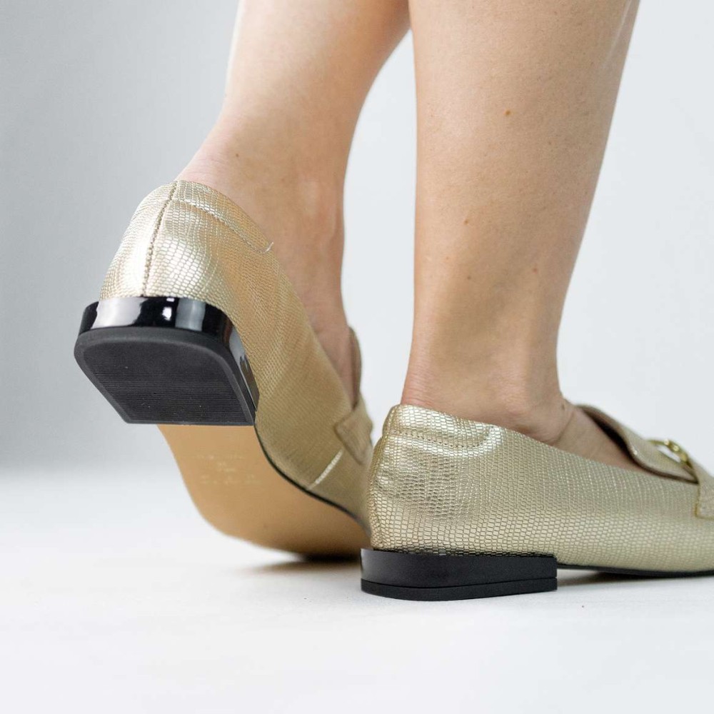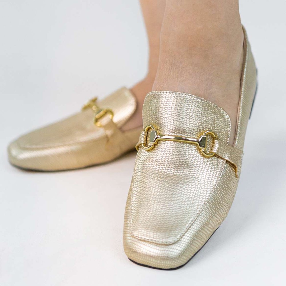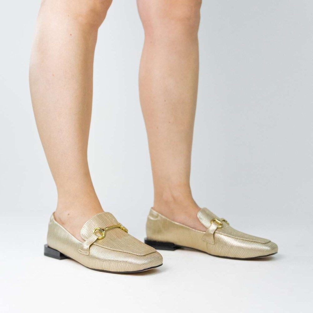Mocassim feminino Glória metalizado, possui textura diferenciada em croco minimalista, salto rasteiro quadrado, bico levemente quadrado e aplicação metalizada em dourado.