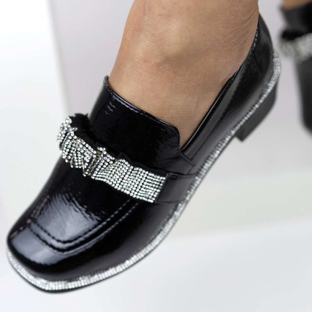Audrey é puro glamour. Em verniz, com muito brilho em strass na cor prata.