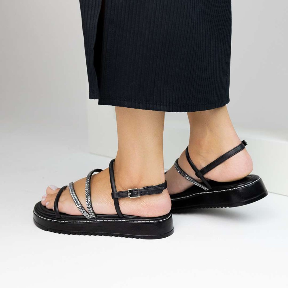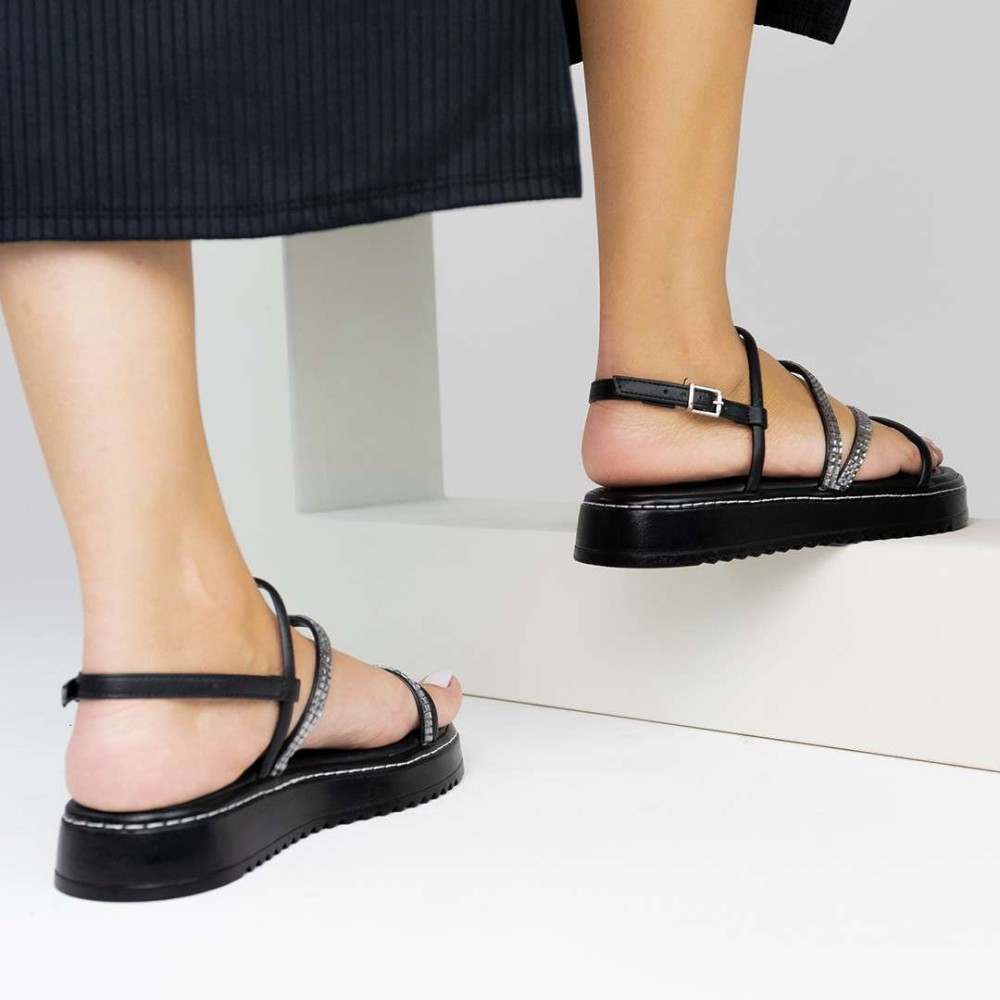 Possui tiras com brilhos em ladrilhos e pesponto na sola que adicionam um charme extra.