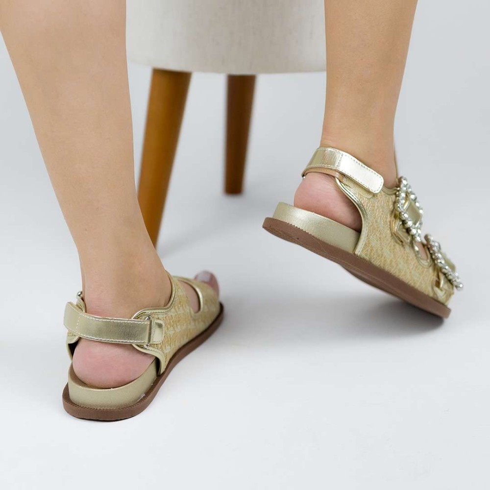 Duas fivelas cravejas em pedras adornam o cabedal trazendo um toque de luxo. As duas fivelas possuem regulagem com ajuste, garantindo um encaixe perfeito nos pés. Além disso possue uma regulagem com velcro no calcanhar.