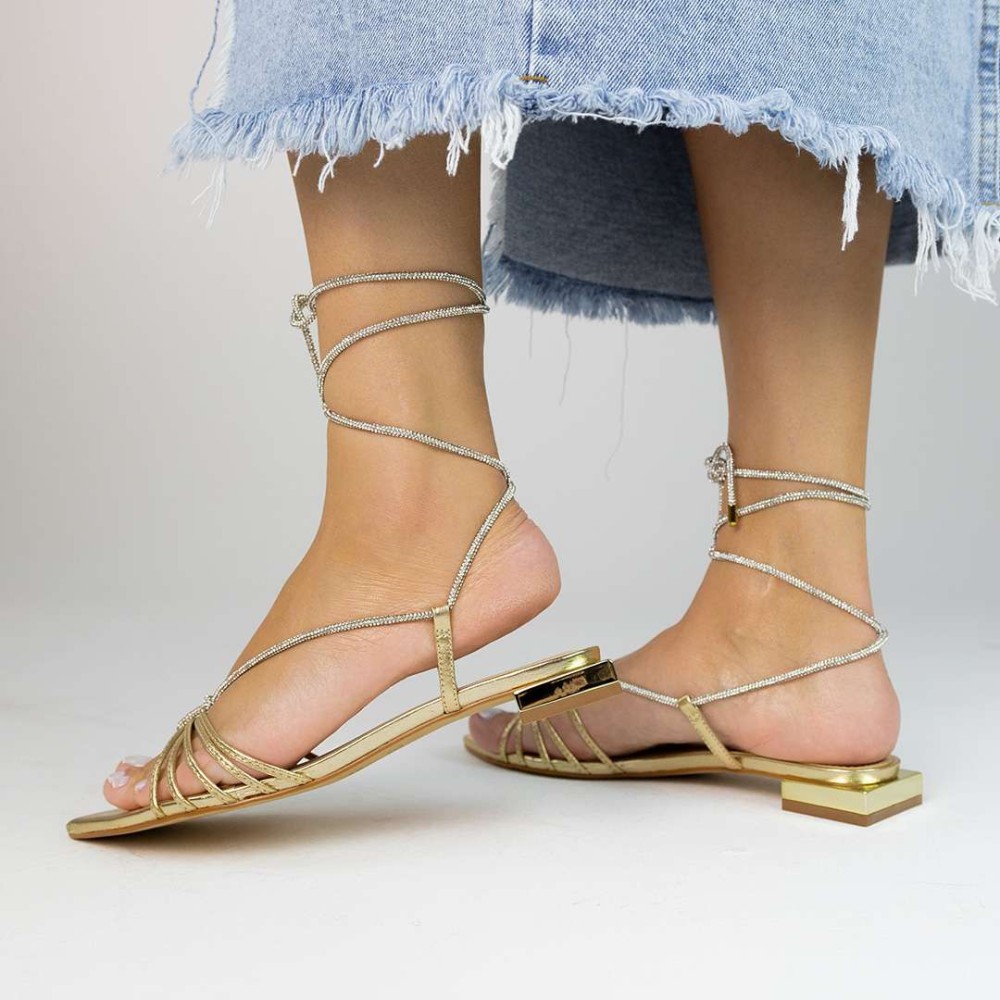 As tiras cravejadas com pedras brilhantes criam um efeito deslumbrante, fazendo com que cada passo seja uma verdadeira obra de arte.