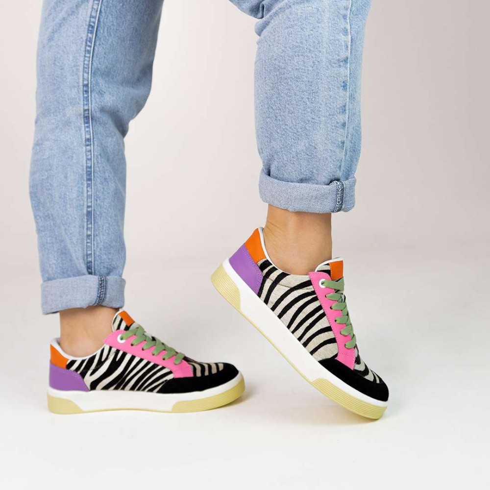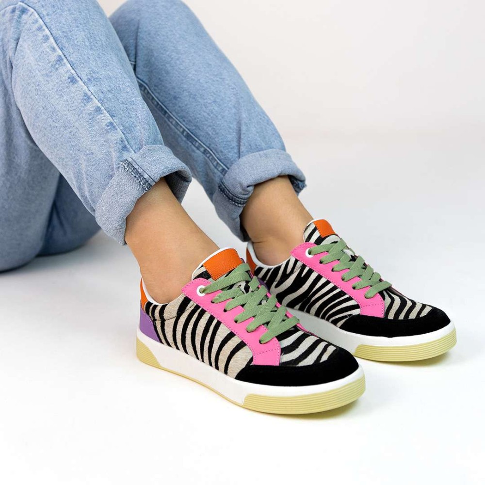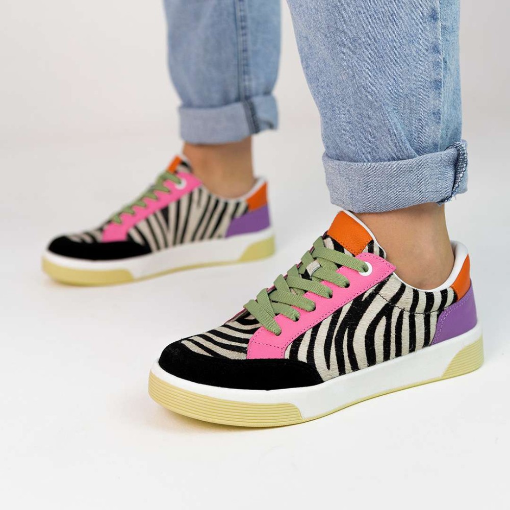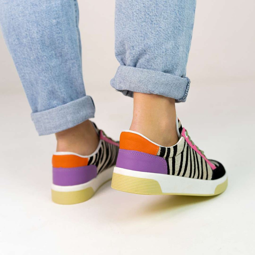 Com um design multicolorido vibrante e detalhes em pelo de zebra, este calçado é uma combinação perfeita de elegância e ousadia.