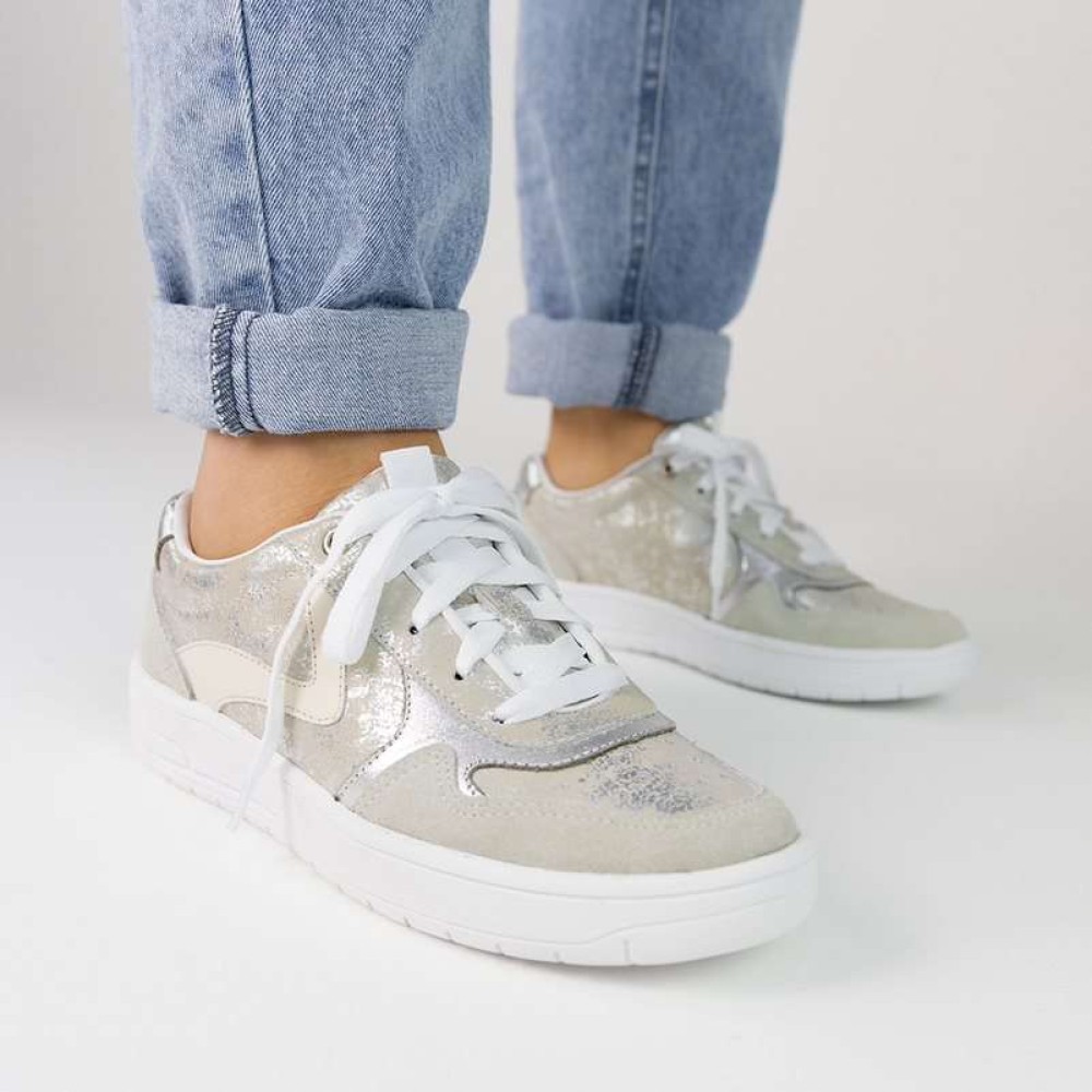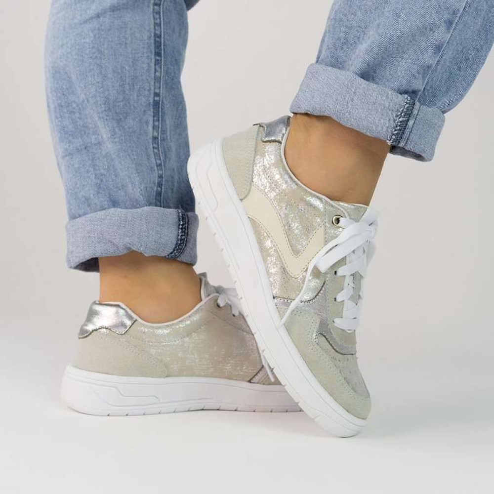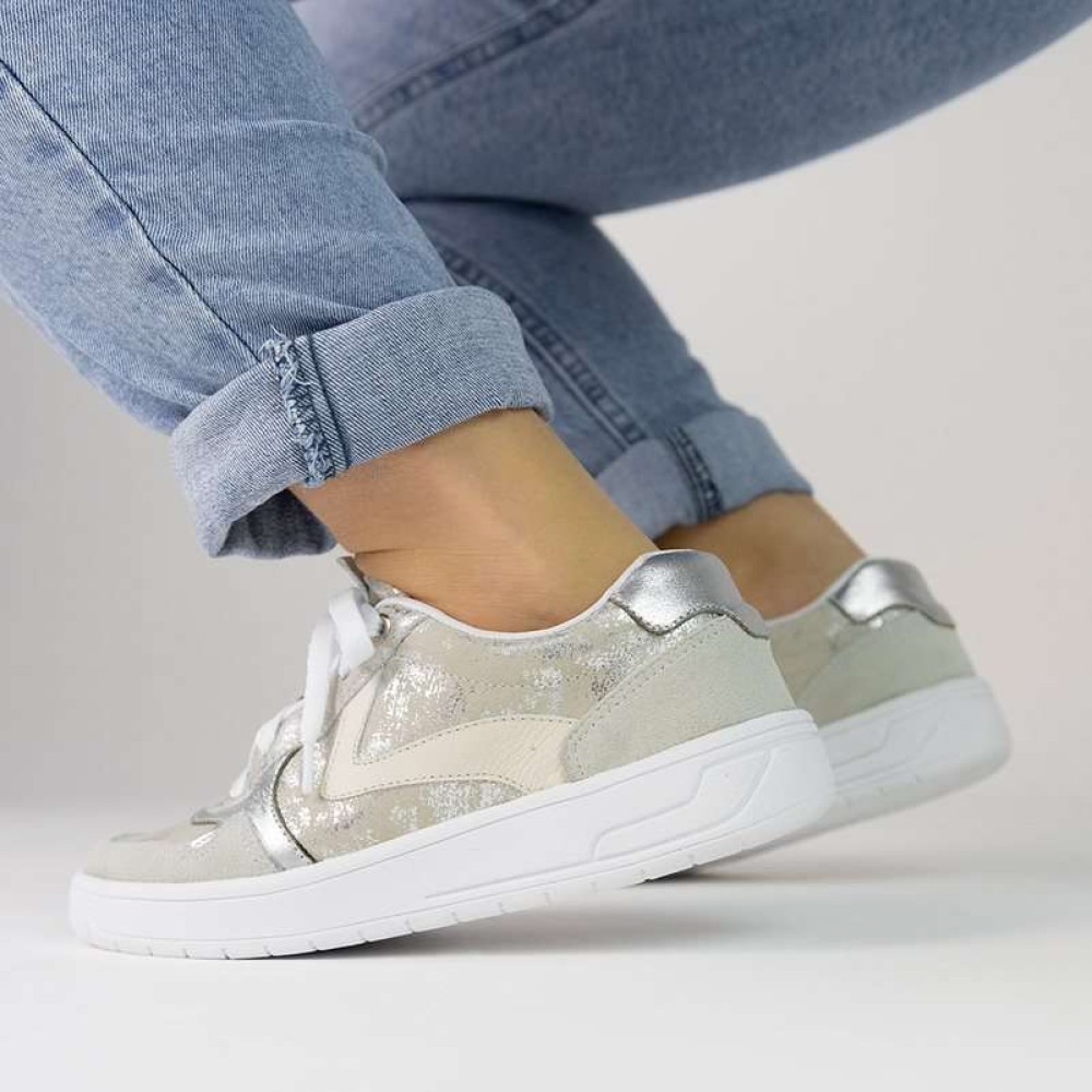 Em couro metalizado prata adiciona um toque de glamour, enquanto a palmilha em gel proporciona conforto incoparavél.
